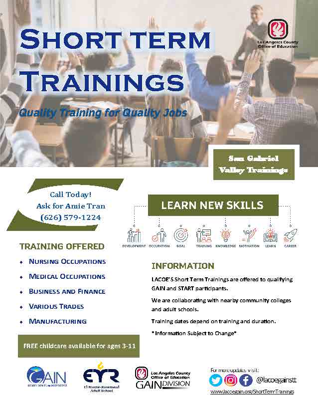 LACOE provides quality training, coaching, job matching and placement to unemployed adults receiving aid through GAIN and START programs. Funding is also available through AJCC-Adult & Displaced Worker Funds. Your active case may qualify you to participate and if approved the training is FREE. No financial aid application required.